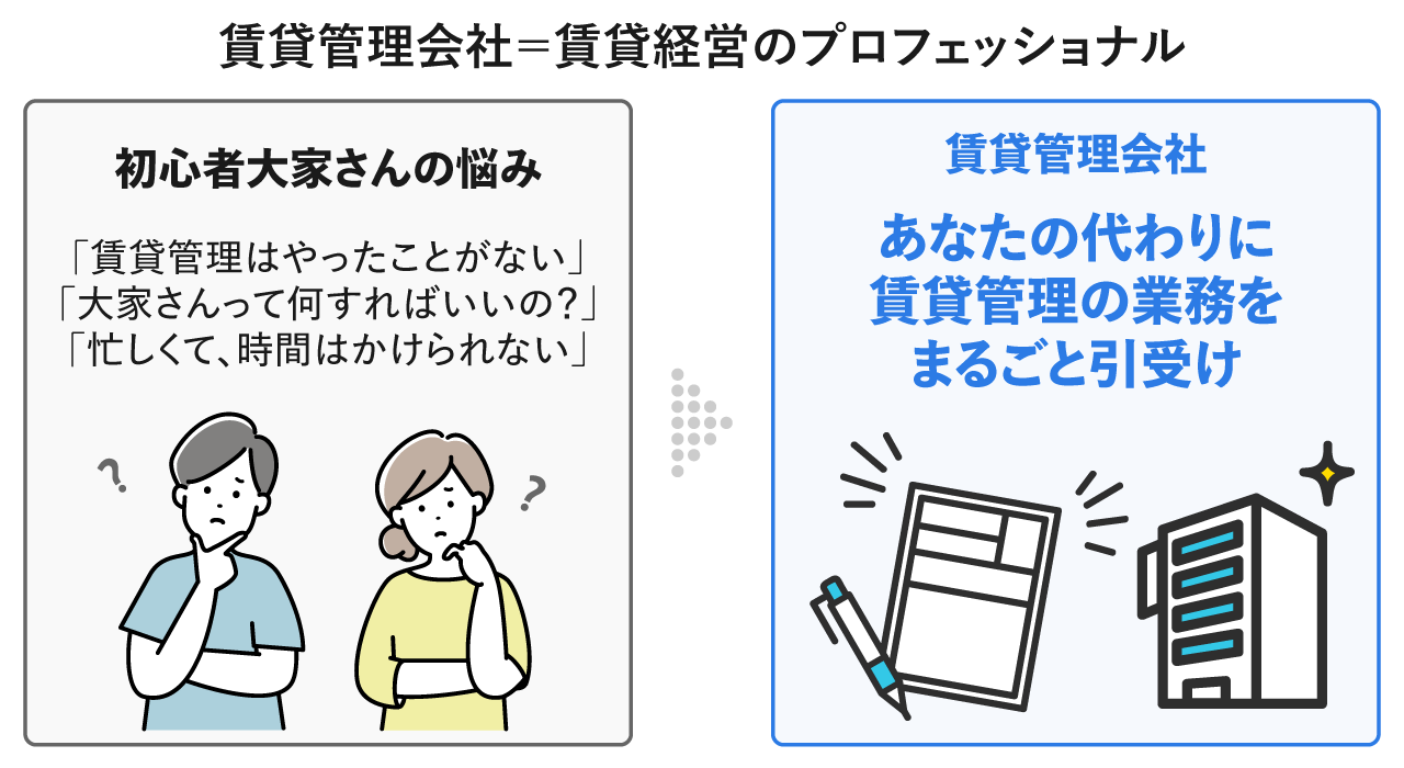 賃貸管理会社は、あなたの代わりに空室対策から家賃回収、入居者からのクレーム対応まで、賃貸管理業務をまるごと引き受けてくれる、賃貸経営のプロフェッショナルです。