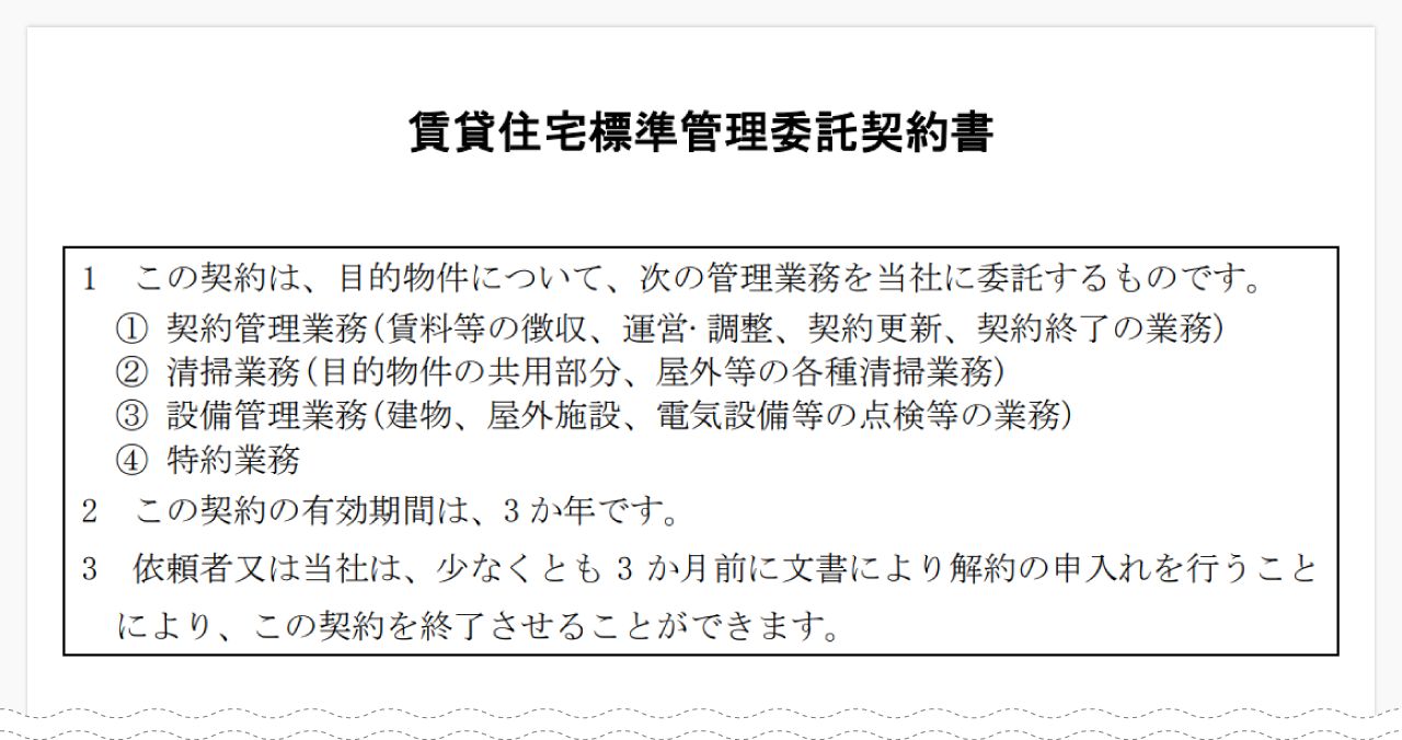 具体的にどのような業務を担うかは、後ほど詳しく解説しますが、国土交通省が出している管理委託契約書のひな型では、「契約管理業務、清掃業務、設備管理業務、特約業務」が挙げられています。