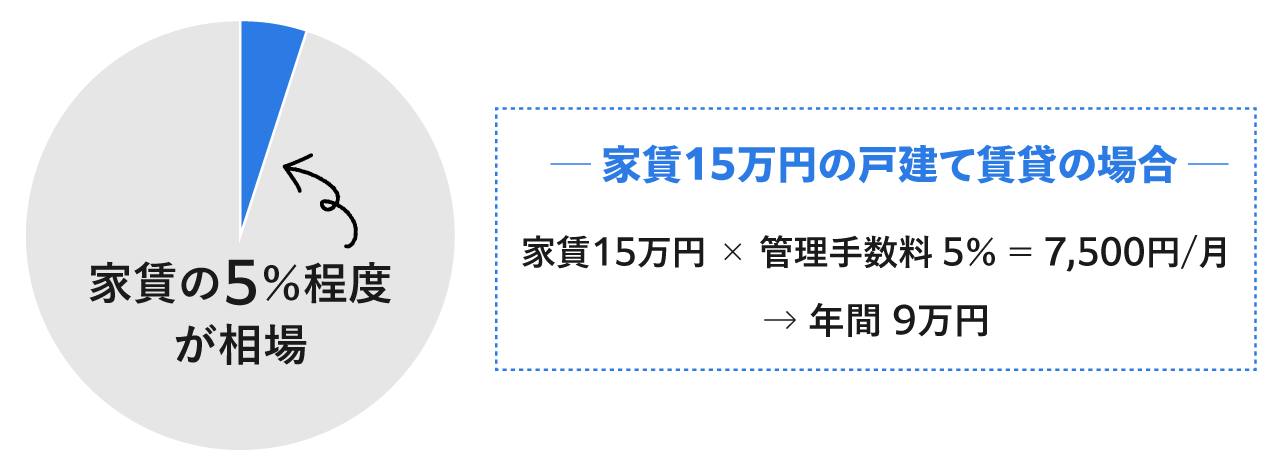 仮に、家賃15万円の戸建て賃貸の場合、5%の管理手数料を支払うと、年間9万円の出費となります。