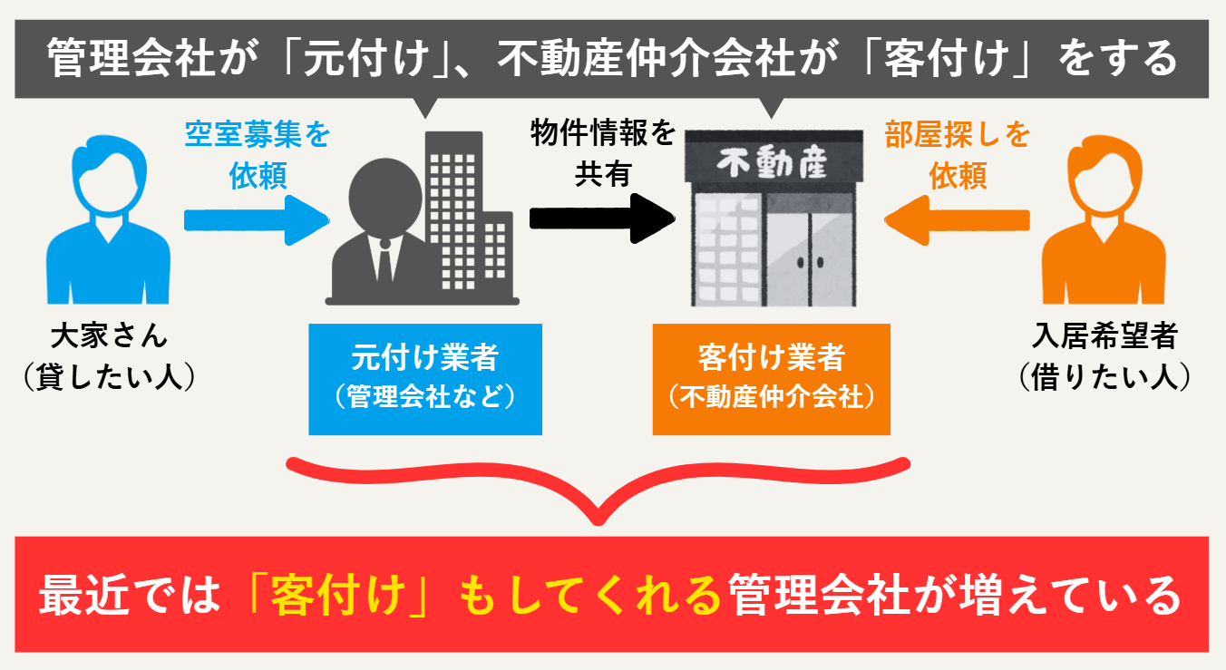 管理会社は元付けとしてオーナーから物件情報を預かって条件設定や広告掲載を行いますが、実際に入居希望者を見つけて内見や契約を進める「客付け」は仲介会社が担うのが本来の形です。