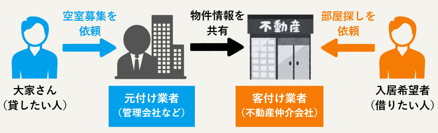 - 客付け=物件を借りたい人(借主)に物件を紹介して、内見や契約までを担当する