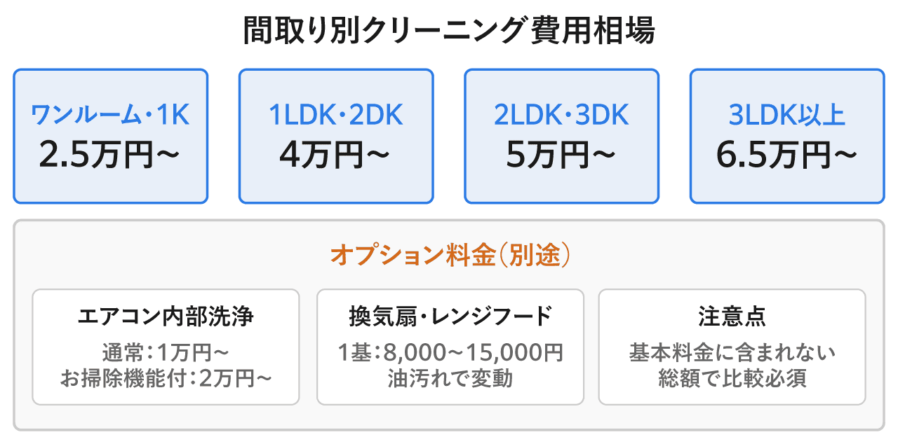単身向けの小型間取りでは、ハウスクリーニング費用はおおむね2〜3万円台が相場です。