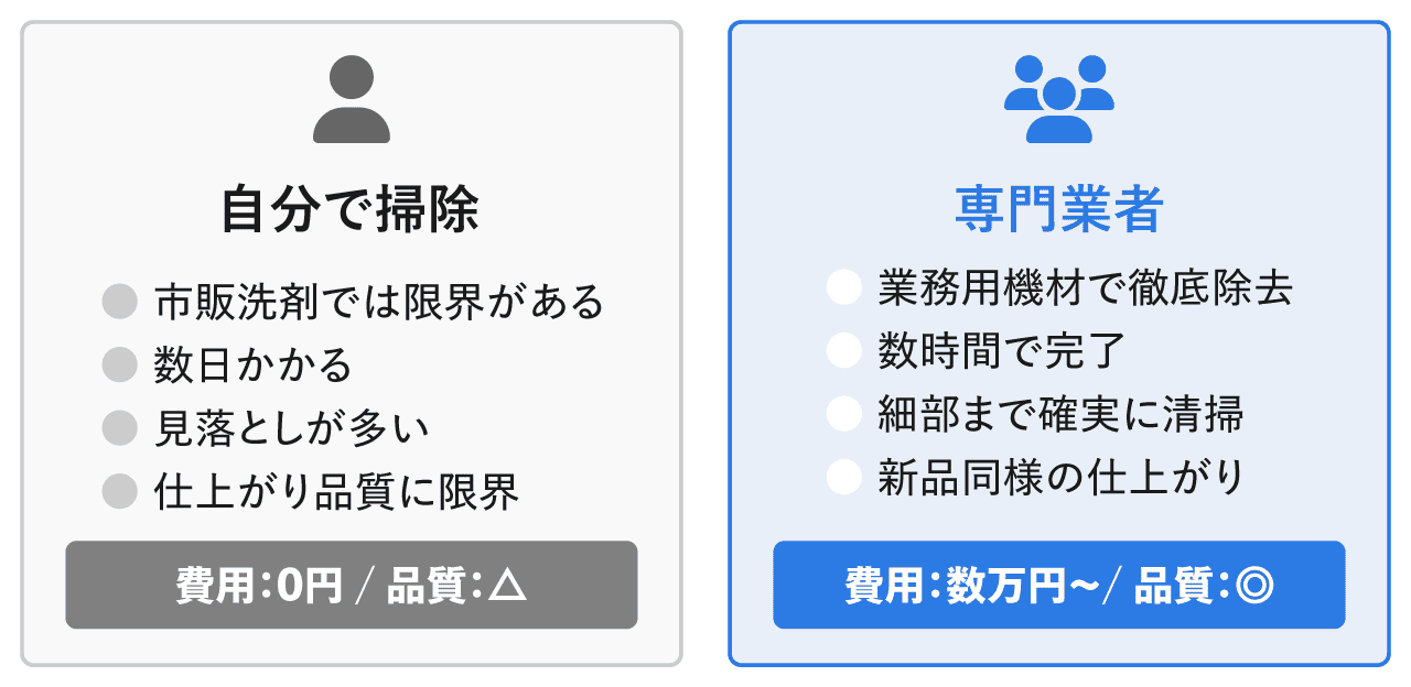 - 自分で掃除する場合と専門業者では清掃の質が大きく違う