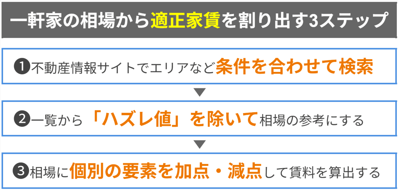 ここまでは、一軒家を貸す場合の家賃相場データや、同じエリアの相場の調べ方、さらに家賃に影響を与える具体的な要素について見てきました。