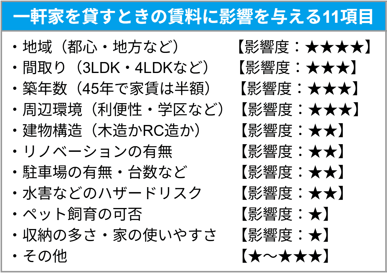 ◆一軒家を貸すときの賃料に影響を与える11の項目