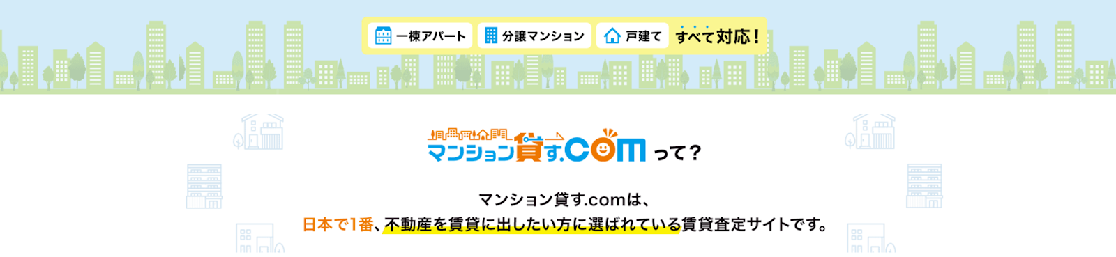 マンション貸す.comは、完全無料で利用できる賃貸管理一括査定サイトです。大手から地元密着型の管理会社まで優秀な管理会社650社以上と提携しており、オーナー様のニーズに合った管理会社を最大6社ご提案いたします。