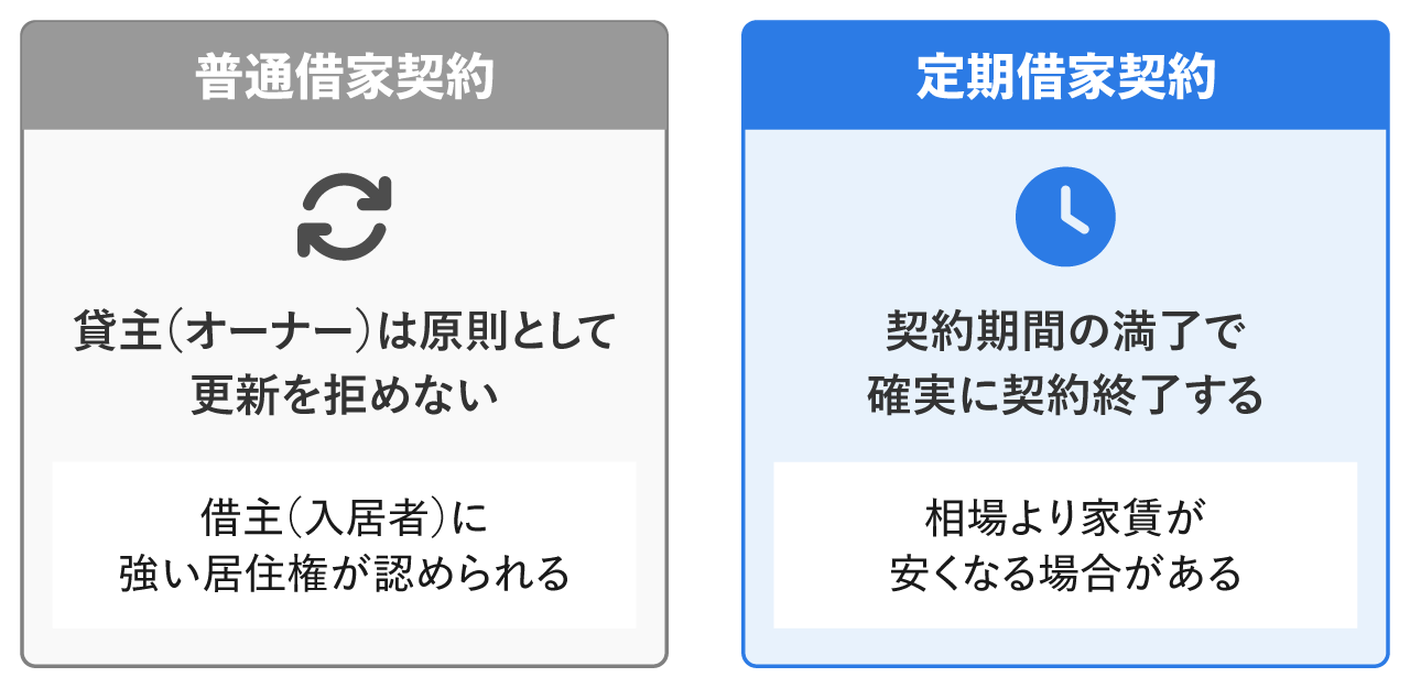・定期借家契約:契約期間が満了すれば、更新されることなく確定的に賃貸契約が終了します。お互いに合意のうえ再契約しない限りは、確実に退去してもらえます。