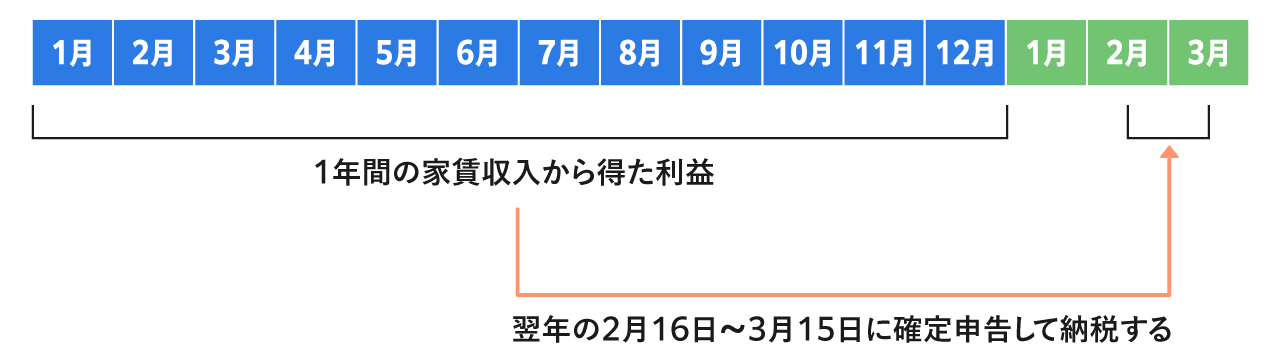 確定申告は、1月1日から12月31日までに得た所得について、翌年の2月16日〜3月15日の期間中に行うスケジュールです。所得税の納税も、同期間中に行います。