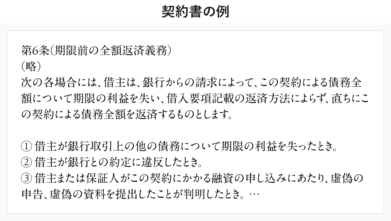 細かな表現は各金融機関との契約書によって異なりますが、「第○条 期限前の全額返済義務」といった条項で、契約違反時の一括返済が定められています。