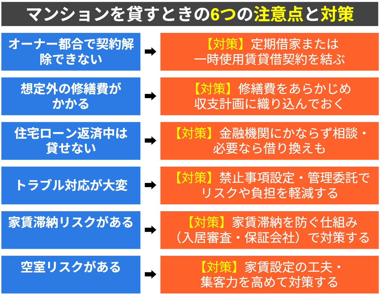 ここまで、マンションを貸すときの6つの注意点とその対策について、詳しく解説してきました。