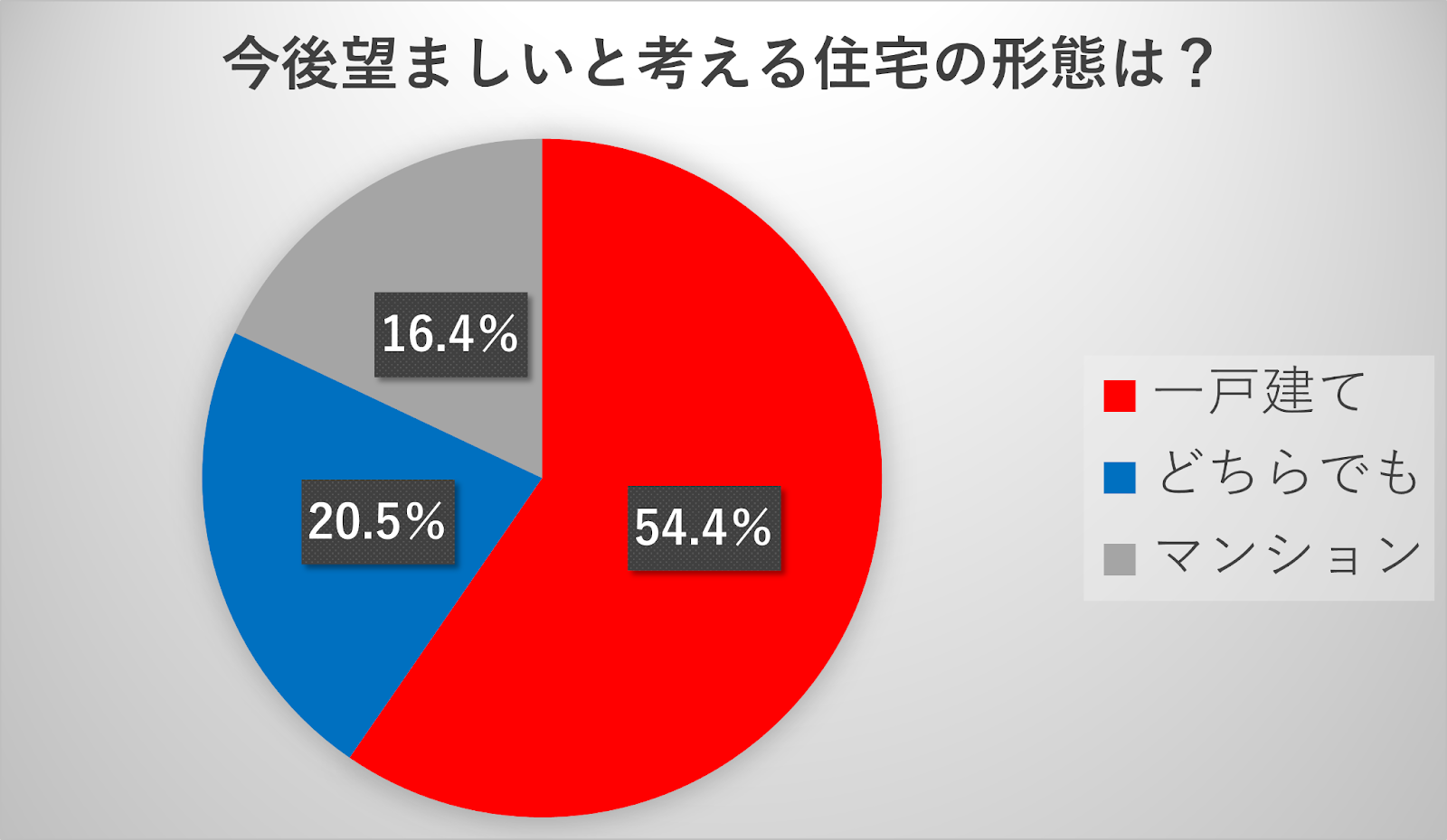 国土交通省が全国の20歳以上の人を対象に実施した、「令和3年度「土地問題に関する国民の意識調査」の概要について」では、今後望ましいと考えている住宅の形態に関する質問の回答について、一戸建てがトップでした。