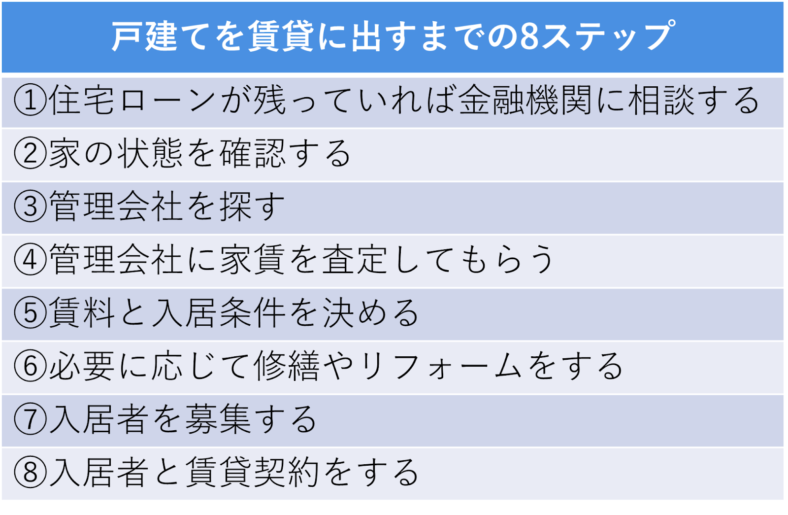 戸建てを賃貸に出すまでは8つのステップがあります。その流れは、以下の通りです。