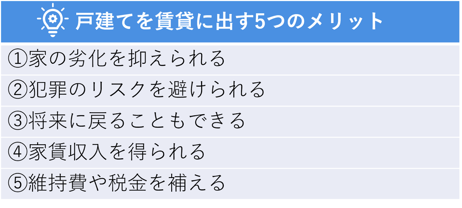 | 1.家の劣化を抑えられる 2.犯罪のリスクを避けられる 3.将来に戻ることもできる 4.家賃収入を得られる 5.維持費や税金を補える |
