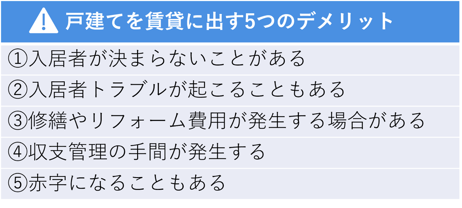 戸建てを賃貸に出すことにはメリットもありますが、以下5つのようなデメリットがあることも知っておきましょう。
