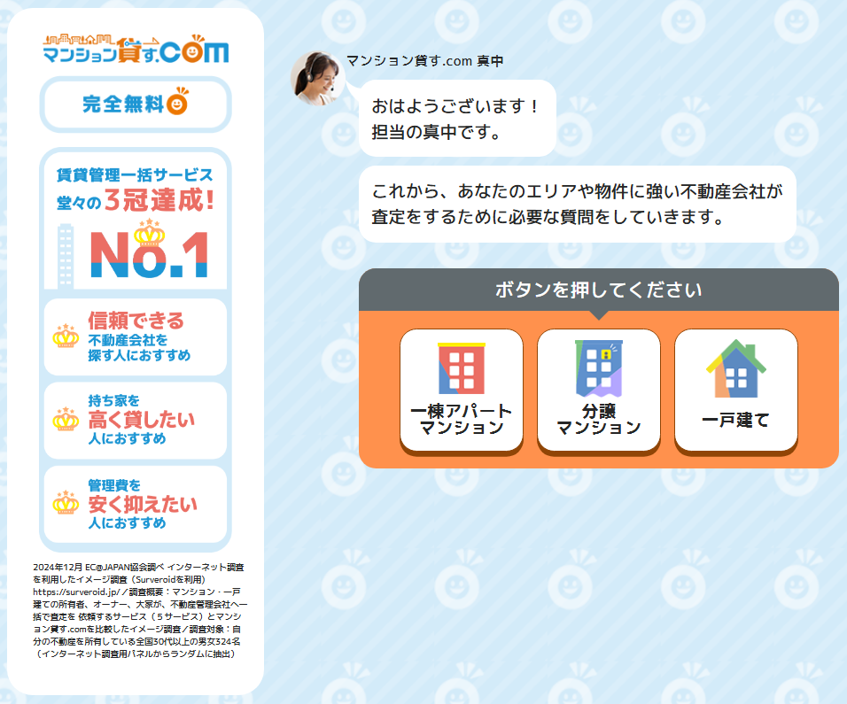 チャット形式の質問に答えるだけで、最大6社の不動産会社がピックアップされて、各社から提案が届きます。オーナーは完全無料で利用できるので安心してお問い合わせください。