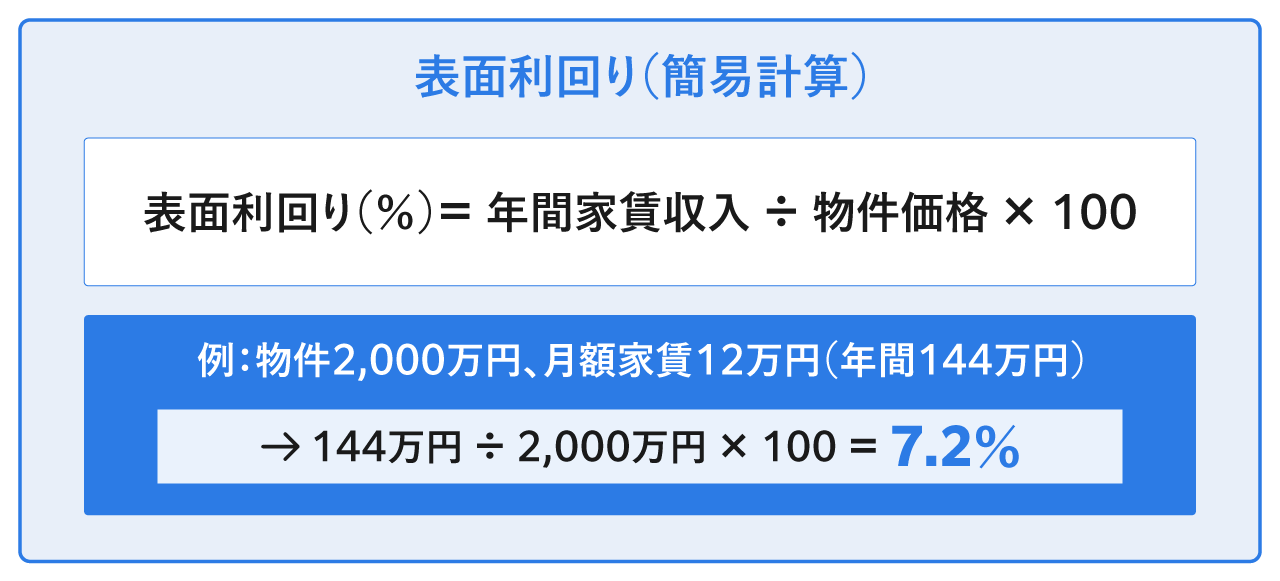 計算式は「表面利回り(%)= 年間家賃収入 ÷ 物件価格 × 100」です。たとえば物件価格2,000万円、月額家賃12万円(年間144万円)の場合、144万円 ÷ 2,000万円 × 100 = 7.2%となります。