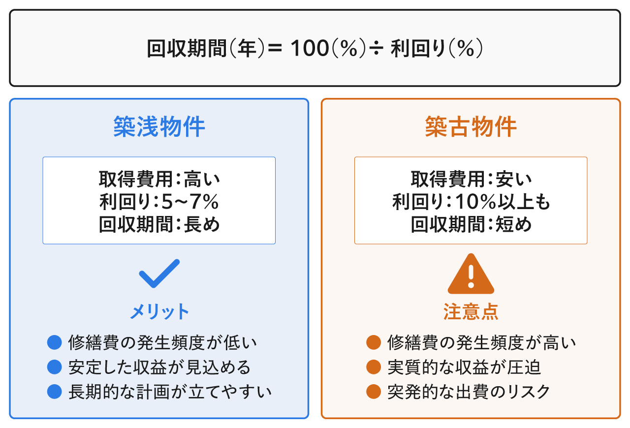 - 築浅物件:取得費用が高く利回りが低くなるため、回収期間は長くなります。ただし修繕費の発生頻度は低く、安定した収益が見込めます。