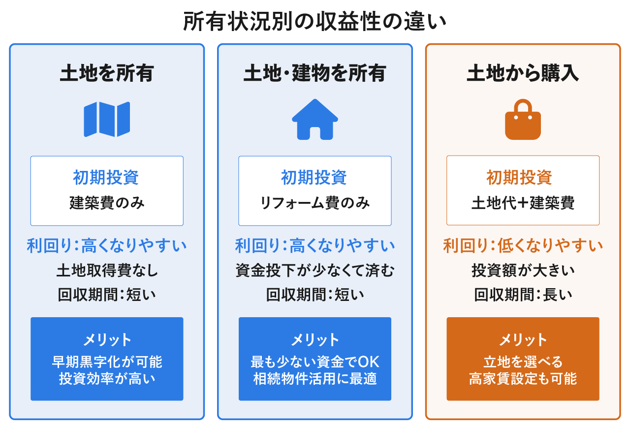 - 土地を所有している場合:固定資産税などのランニングコストを家賃収入で賄えれば、早期に黒字化を達成できます。利回りが高く、回収期間も短くなります。