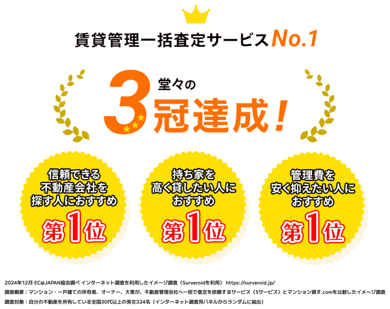 最短60秒の簡単入力で厳選された最大6社から査定が届きますので、本当に信頼できる管理会社と出会うためにご利用ください。