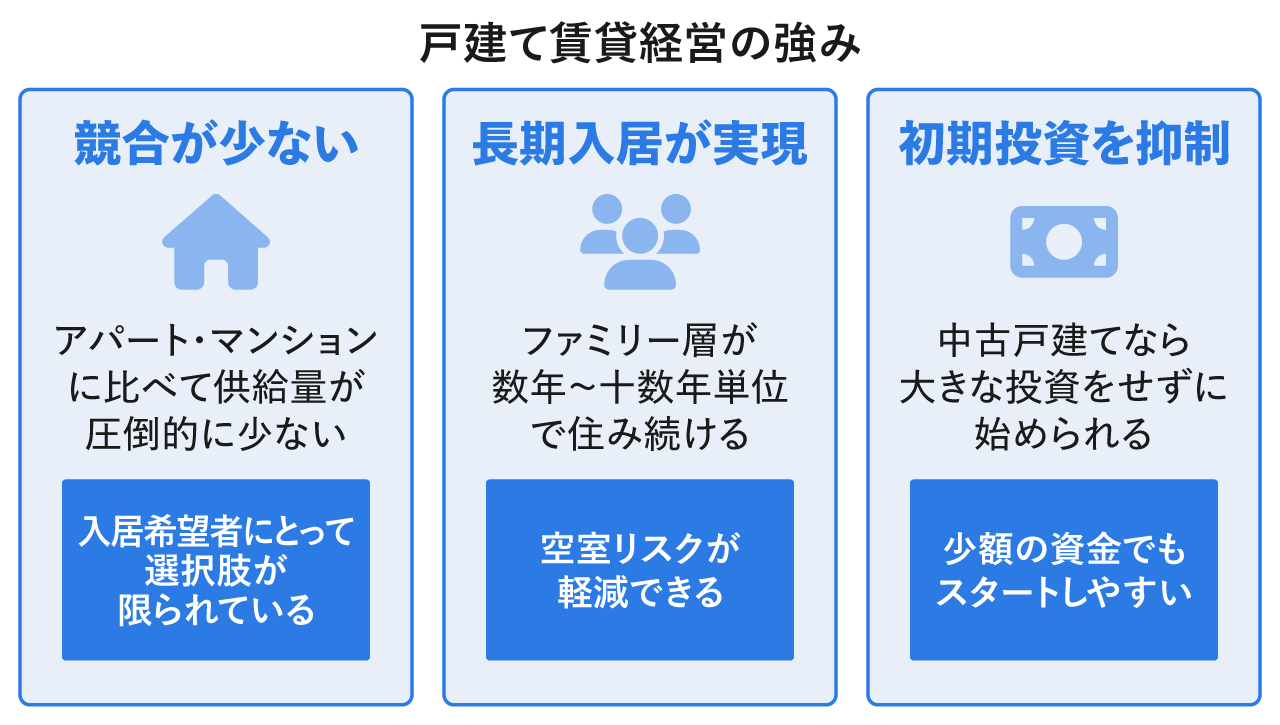 じつは、戸建て賃貸はアパート経営に比べて競合が少なく、一度入居すれば長く住んでもらえるという大きな強みがあります。