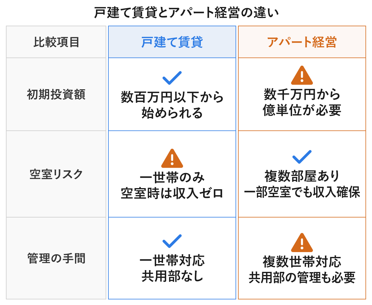 戸建て賃貸経営と並行して、アパート経営についても検討している方もいるでしょう。どちらも賃貸収入を得る不動産投資ですが、投資規模・リスク構造・運用方法において違いがあります。