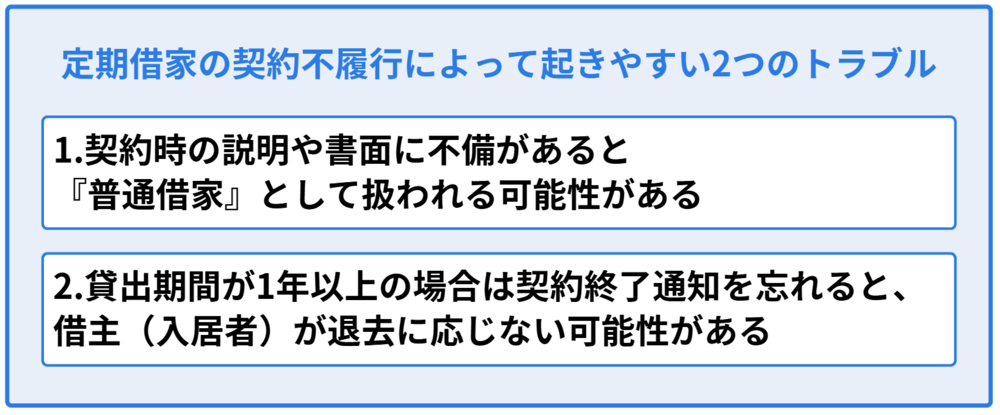 手続きや運用方法を誤ると契約トラブルにつながりやすい点も、定期借家のデメリットといえます。