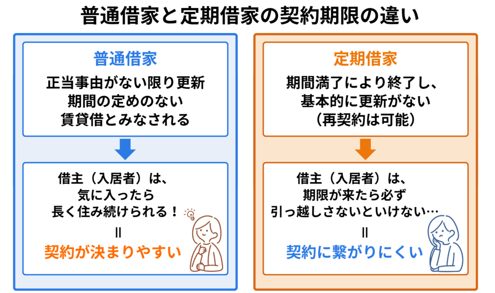 この背景には、普通借家と定期借家の大きな違いである契約期限が、借主(入居者)側にとって不利に感じられやすい点があります。