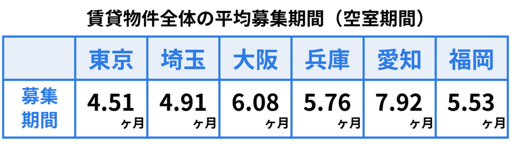 また、株式会社タスの調査で公表されている、賃貸物件全体の平均募集期間(空室となっている期間)では、最短でも約4ヶ月、最長では7ヶ月以上かかるケースが示されており、定期借家の場合はさらに空室期間が長引く可能性も考えられます。