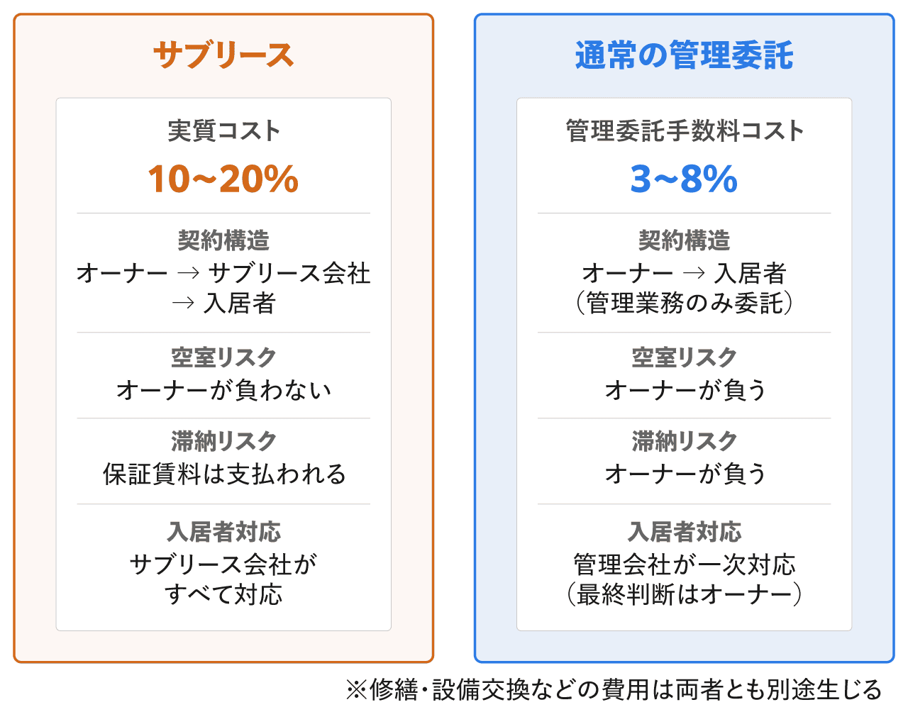 「通常の管理委託と比較して、サブリースってどうなの?」という点についても、整理しておきましょう。