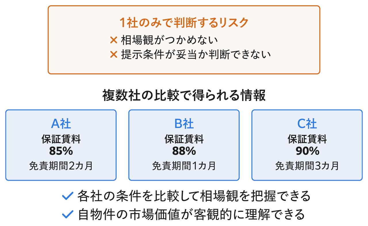 同じ物件でも各社で保証賃料の評価が異なり、契約条件の組み合わせも変わります。複数社の提案を並べれば、自物件の市場価値が客観的に把握できます。