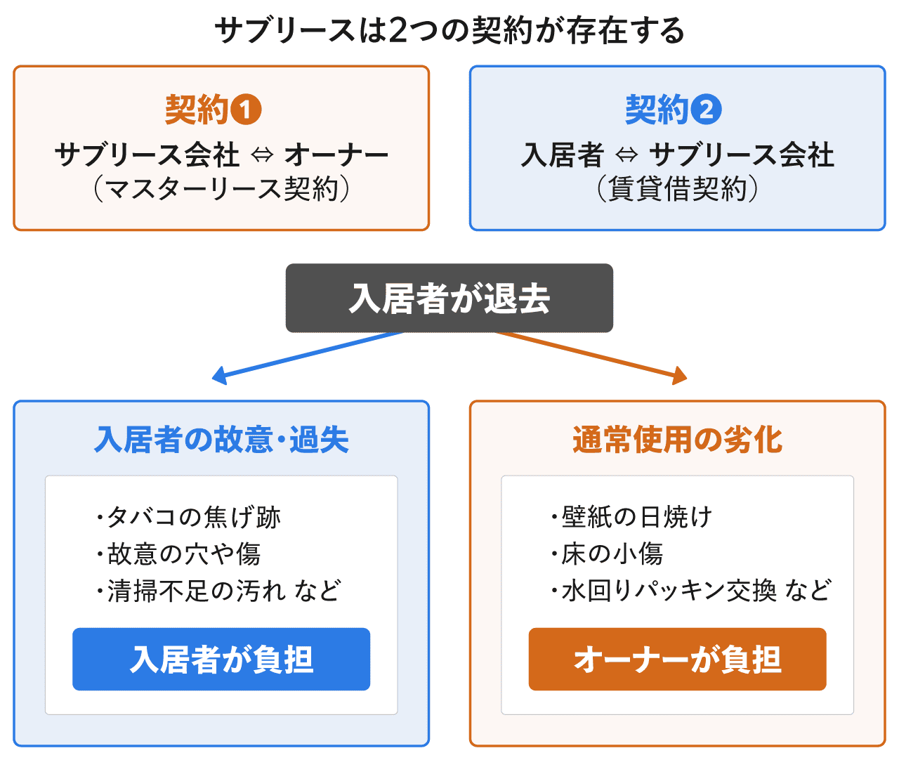 入居者が退去する際、入居者はサブリース会社に対して原状回復義務を負います。一方、次の入居者を迎えるための室内修繕費用は、多くの契約でオーナー負担となっています。