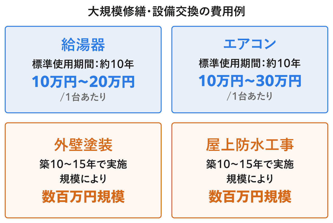 たとえば、給湯器やエアコンの標準使用期間は約10年程度です。設備1台あたり10万円〜30万円程度の交換費用を見込む必要があります。