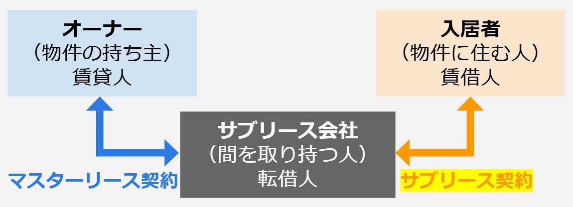 狭義のサブリースという言葉は、サブリース会社が、オーナーから借りた物件を入居者に又貸し(転貸)する場合に、サブリース会社と入居者(実際に住む人)の間で結ぶ契約をいいます。下画像でいうと右側の部分の契約(オレンジ色の両矢印)がサブリース契約です。