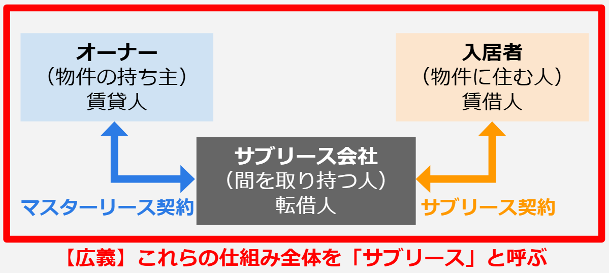 広義のサブリースでは、オーナーがサブリース会社に物件を貸し、その物件をサブリース会社が入居者に転貸する(又貸しする)という仕組み全体を「サブリース」といいます。以下の画像の通り、マスターリース契約も、サブリース契約(=狭義のサブリース契約)も、両方を含めて「サブリース」の一部という考え方です。
