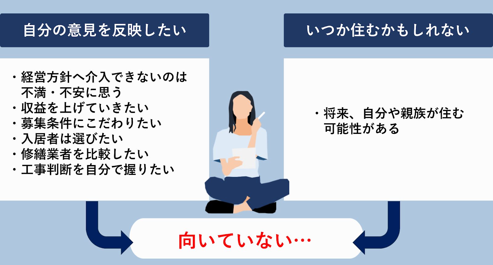 ◎空き家のサブリースが向いていないのは、少しでも自分の意見や方針を物件運営に反映したい人、そして今後住む予定がある人です