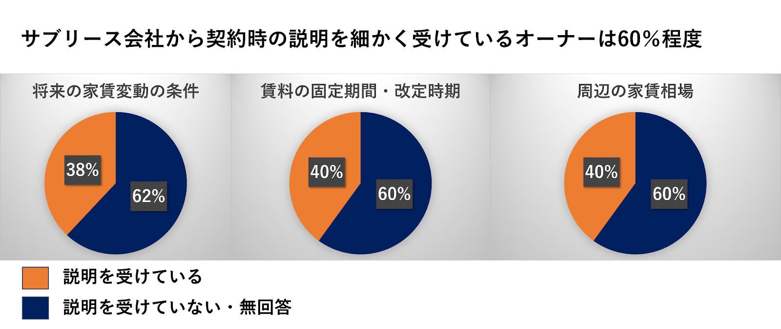 実際に国土交通省が実施した賃貸住宅管理業務に関するアンケートでは、サブリース契約において下記のような賃料に関する説明を受けているオーナーは、60%程度にとどまっています。