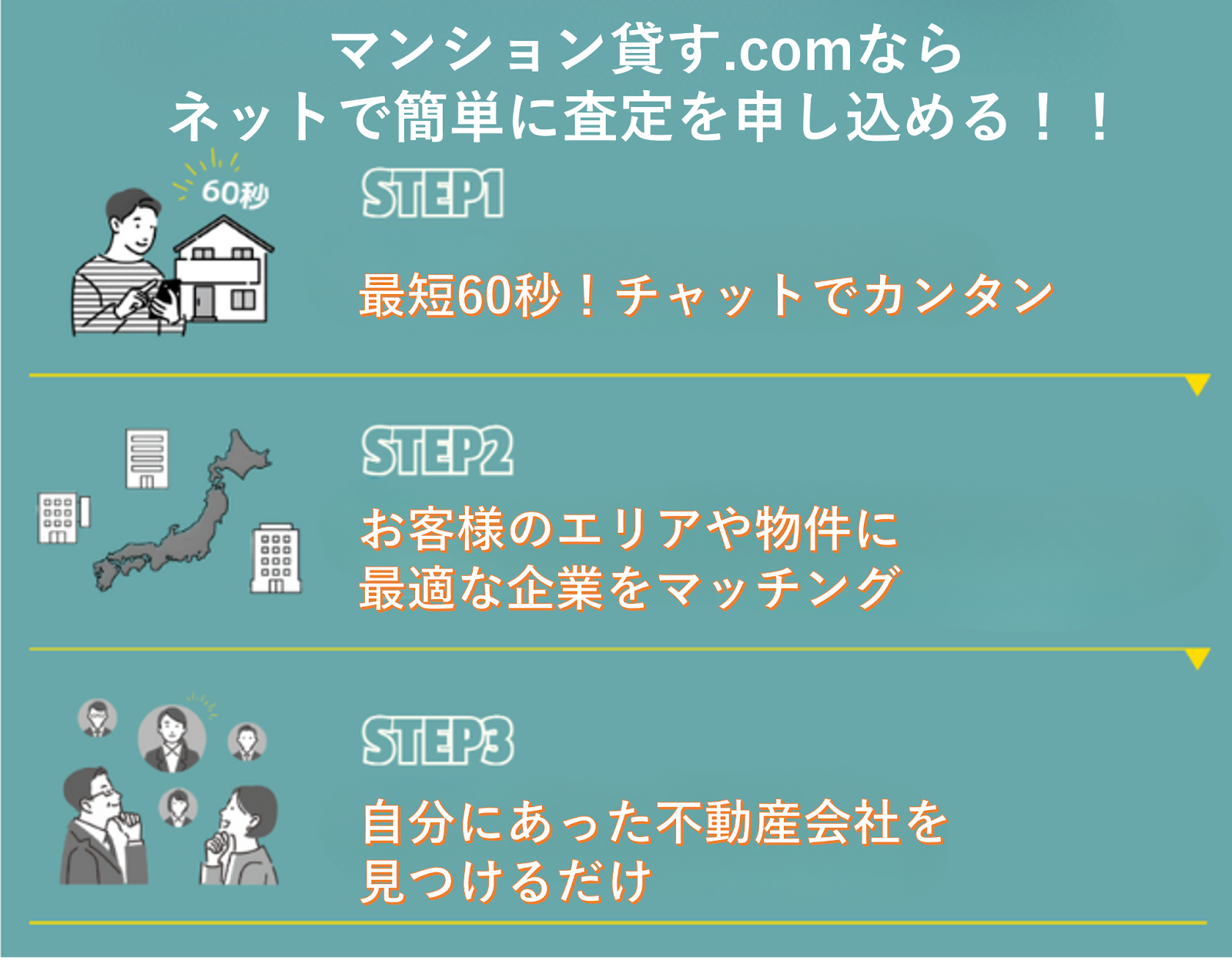 マンション貸す.comの利用方法は、チャット形式で空き家に関する質問に答えていくだけ。60秒ほどで入力を終えられ、最短翌営業日には管理会社を最大6社ピックアップします。