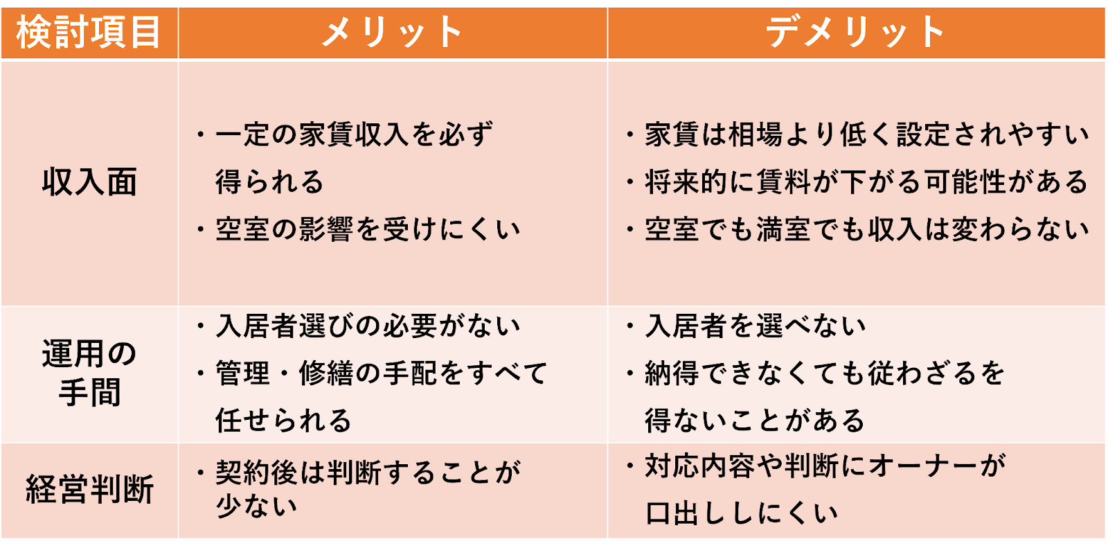 なぜならサブリース契約は以下のような検討項目ごとに、メリットとデメリットが表裏一体になるからです。