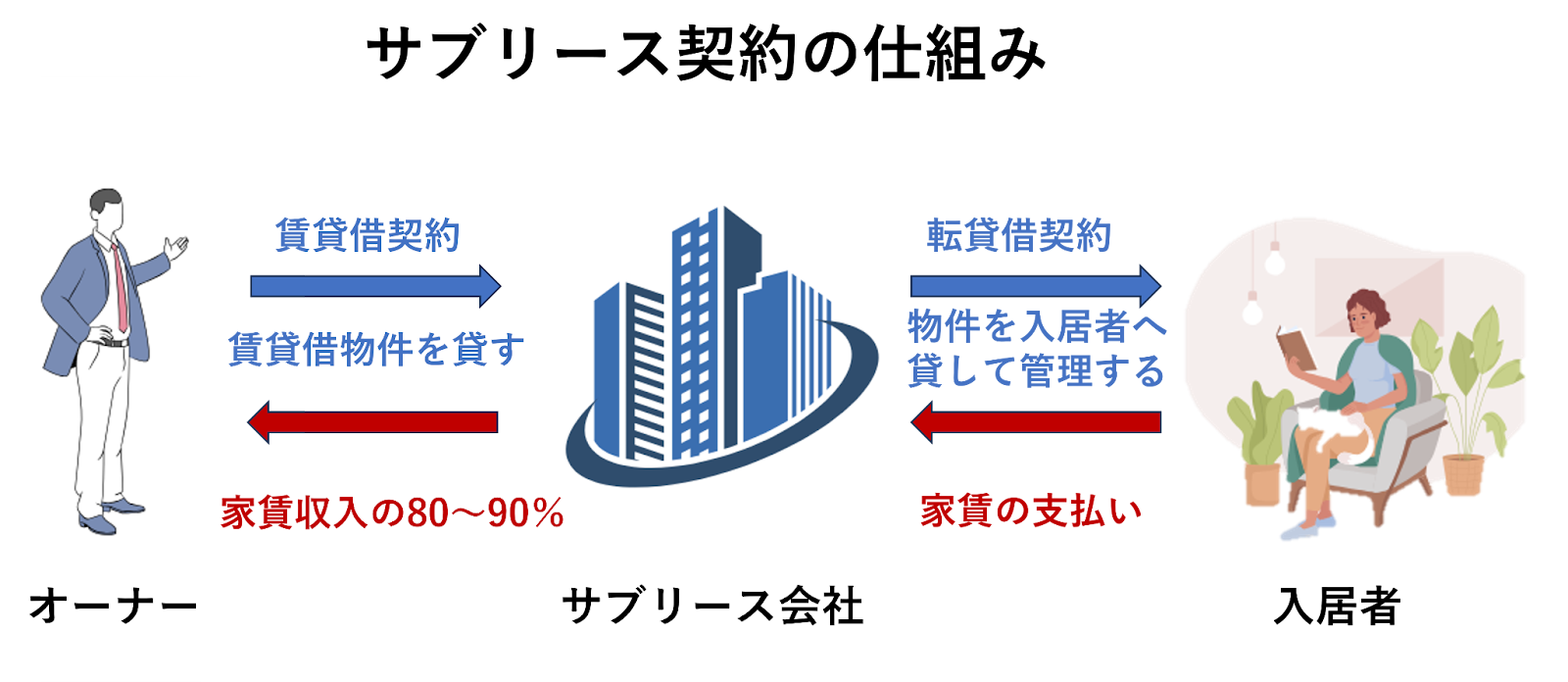 サブリースは、オーナーがサブリース会社に所有する物件を一括で貸し、サブリース会社が入居者へ転貸する仕組みです。