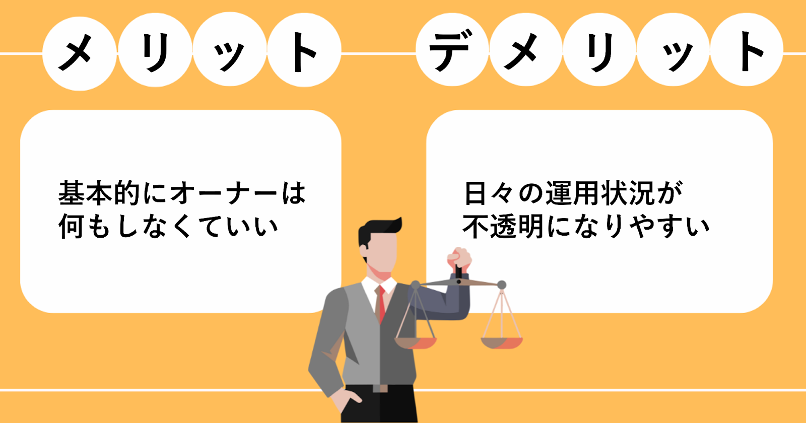 手間を極力減らし、運営の詳細が見えにくくなる点を許容できるか。経営の中身に主体的に関与したい場合はミスマッチになりやすい。