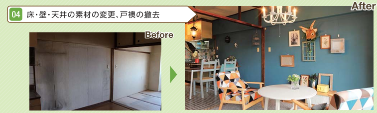 例えば、下記のように、空き家の壁の色や間取りなどを変更して、借主の理想の住まいを実現できます。