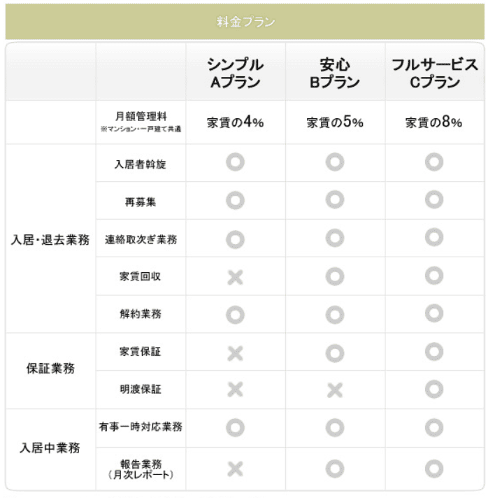 家賃の4%〜8%の範囲で、「シンプルAプラン」「安心Bプラン」「フルサービスCプラン」の3つから選択でき、必要な業務量に応じて自由にプランを選べる仕組みです。