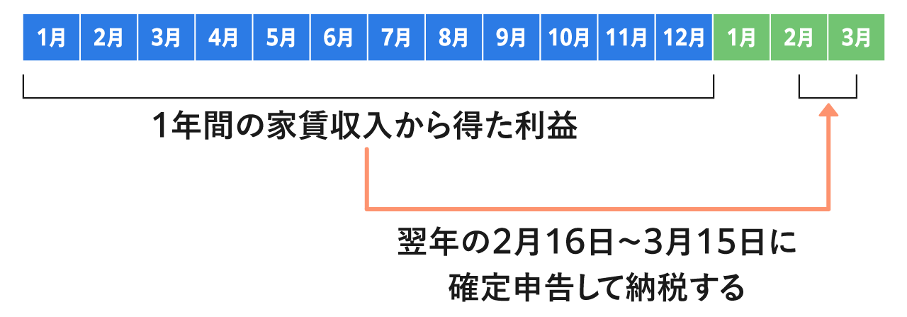確定申告を行う期日は、毎年2月16日〜3月15日です。前年の1年間の家賃から得た不動産所得を申告します。