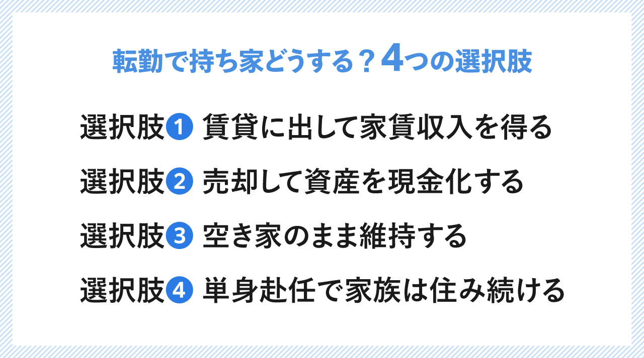 転勤時の持ち家の選択肢として、4つを解説しました。