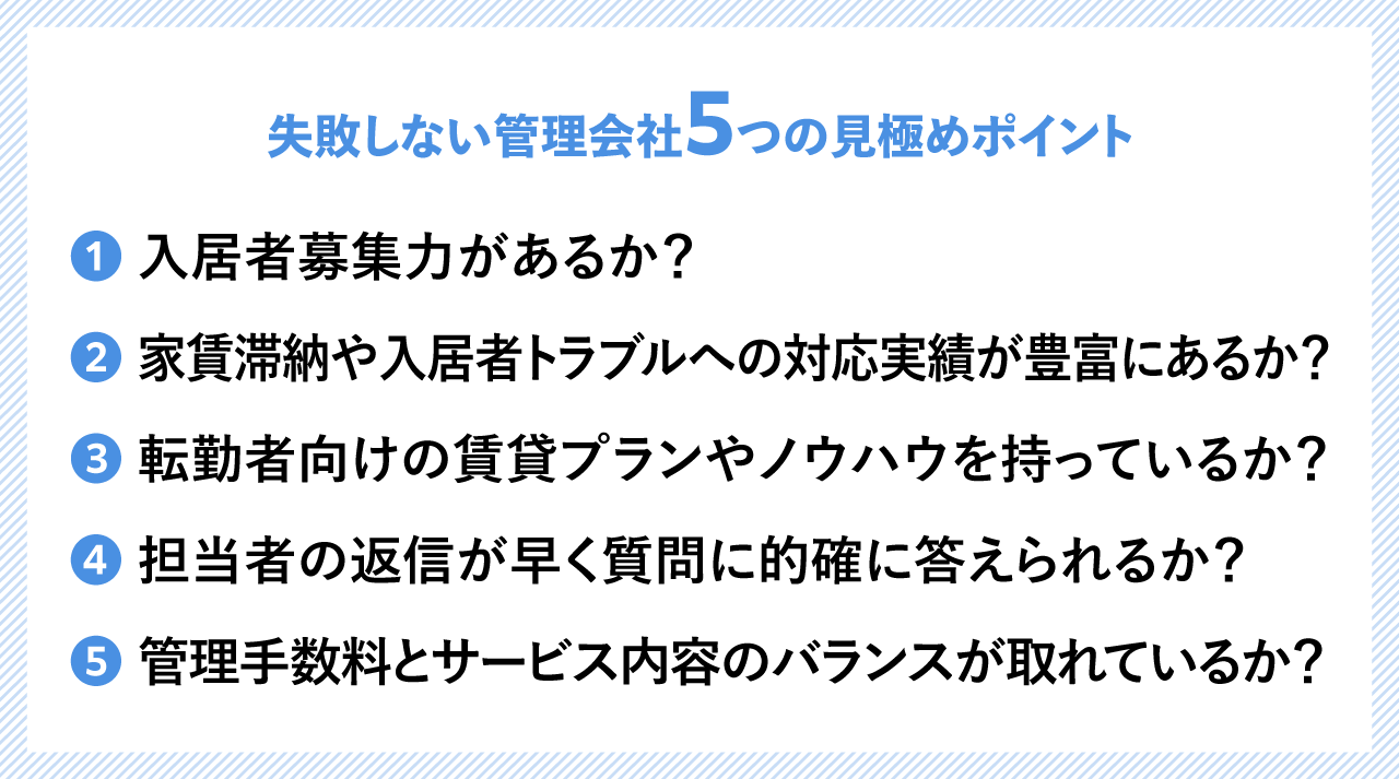 失敗しない管理会社を選ぶ、5つの見極めポイントは以下のとおりです。