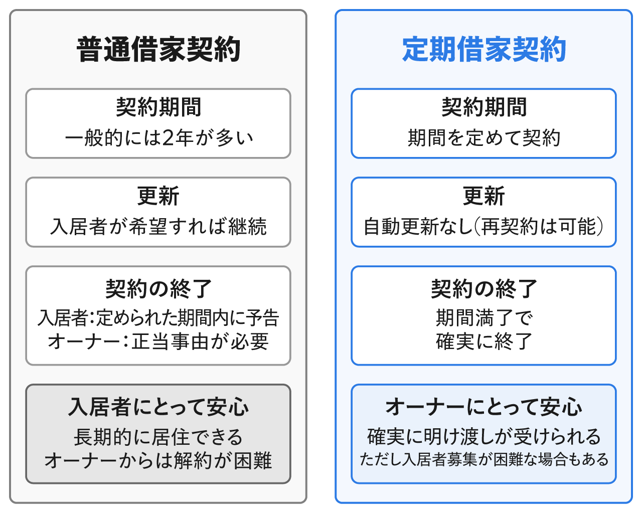 通常の賃貸借契約(普通借家契約)では、借主の権利が強く保護されており、貸主の都合での解約が難しいことをお伝えしました。そこで選びたいのが「定期借家契約」です。