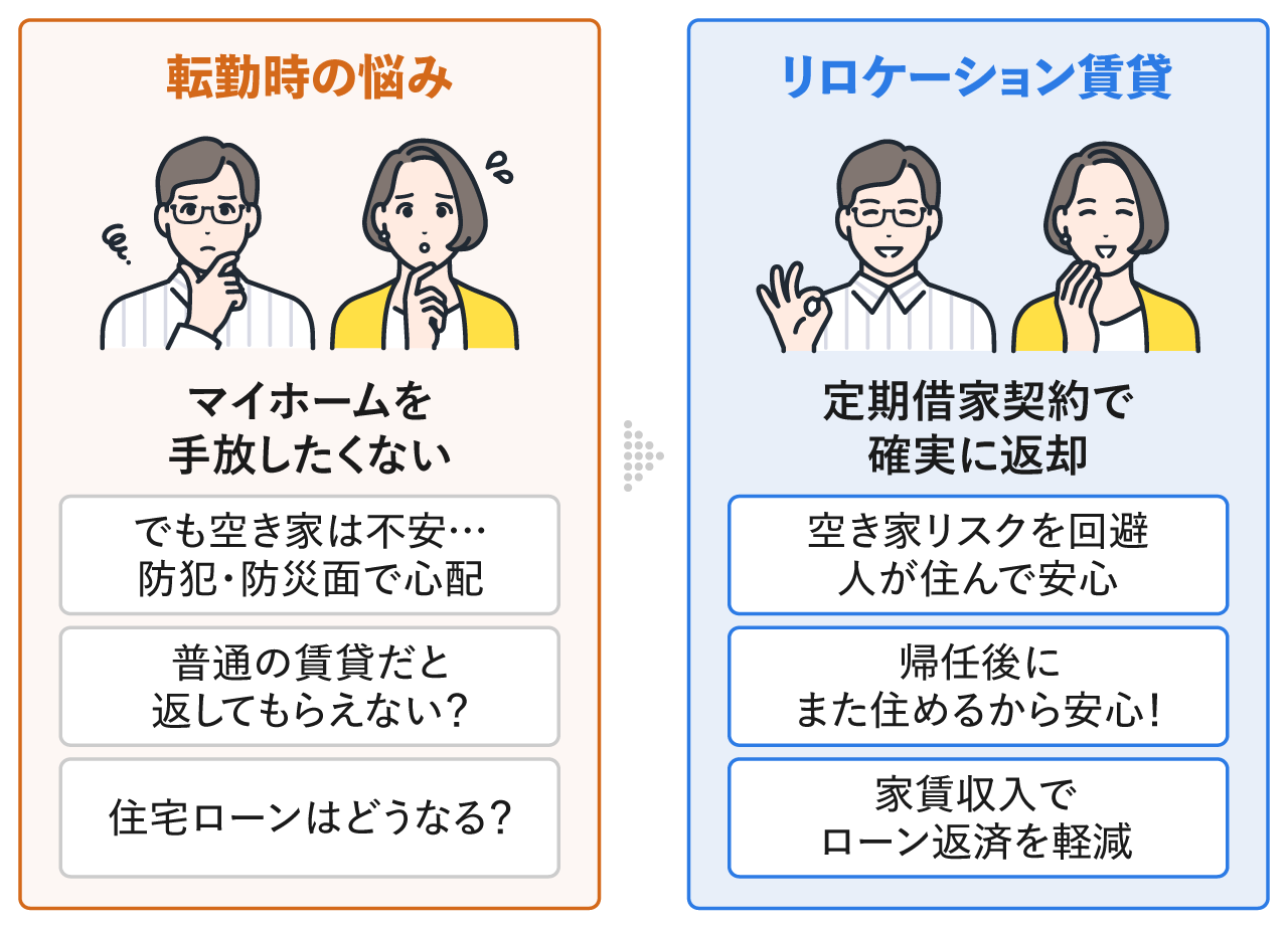 「転勤で自宅を空けるけれど、マイホームは手放したくない」「でも、空き家のまま放置するのは不安だ」「賃貸に出した場合、帰任後にちゃんと返してもらえるのだろうか」