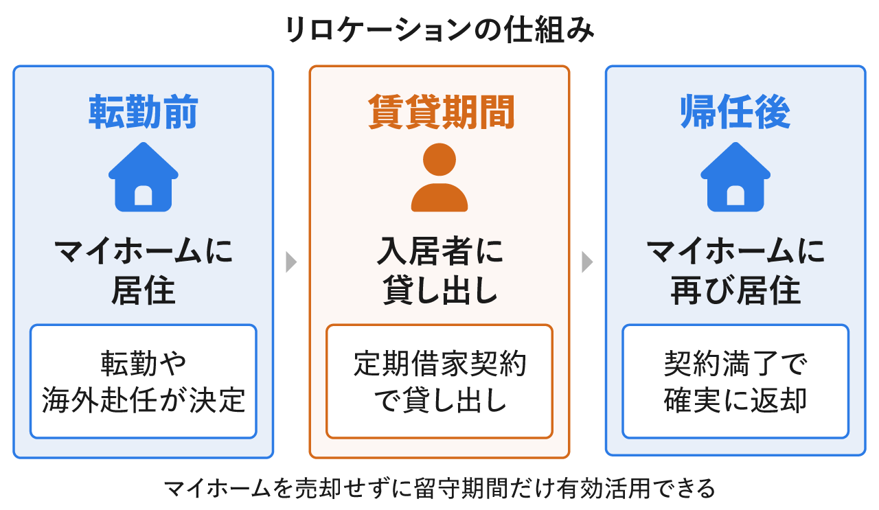 リロケーションは、転勤・海外赴任などで長期間留守にする自宅を、その期間だけ第三者に貸し出す仕組みを指します。マイホームを売却する必要がなく、帰任後にまた住める点が大きな魅力です。
