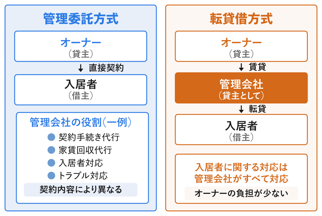 - 管理は転貸借方式か管理委託方式の2種類から選ぶ